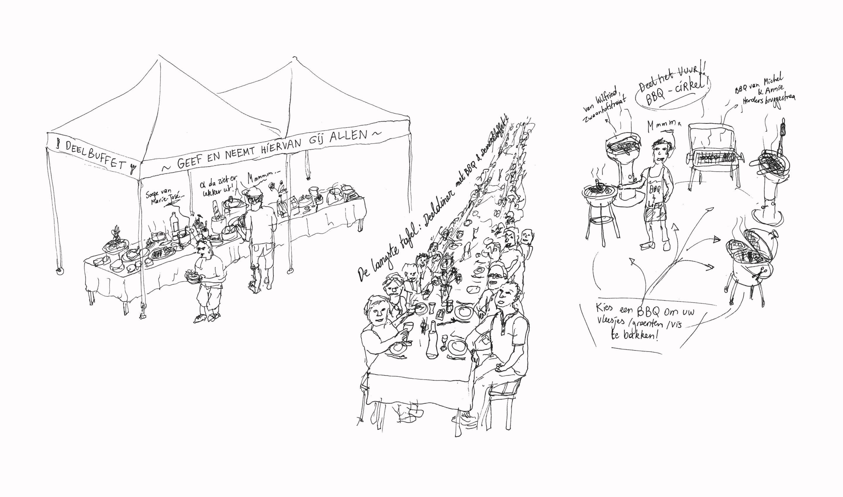 We maken een superlange tafel en iedereen brengt iets lekkers mee van eten/drank voor het deelbuffet. We zoeken ook barbecues van mensen, en maken een bbq-cirkel waar je jouw vlees/vis/groentjes ter plekke op kan laten grillen. Nadien blijven we gezellig tafelen en is de bar open.
